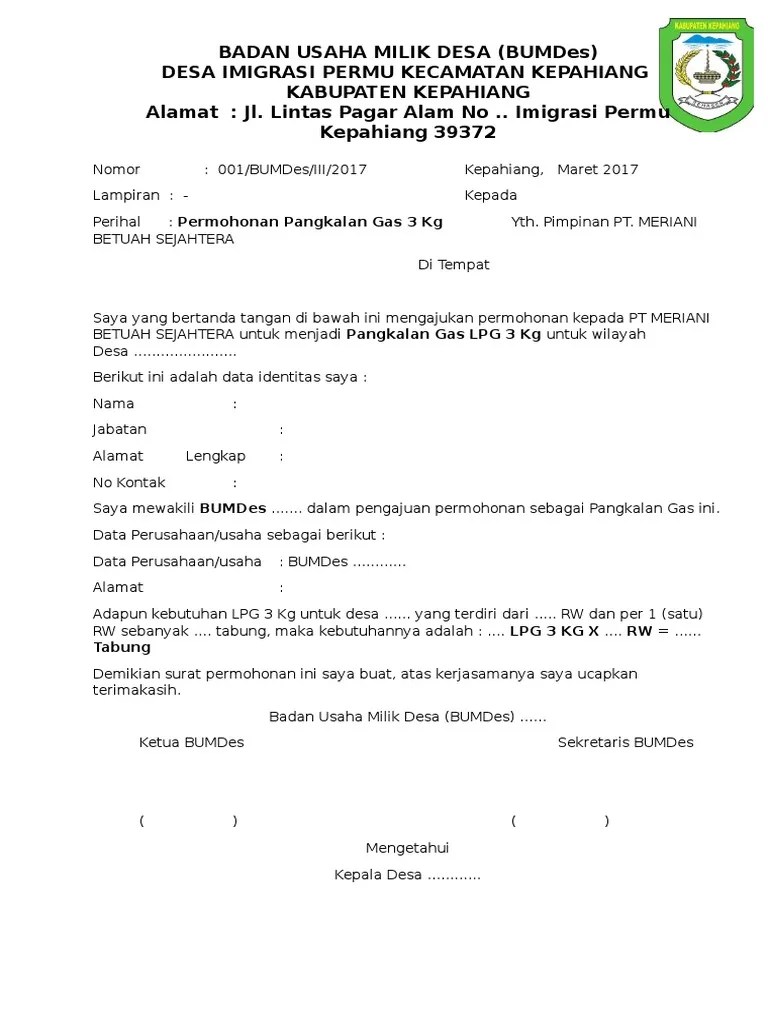 Permohonan ini untuk menjadi agen gas lpg 3 kg ini dibuat untuk membuka usaha,. Mengisi dan menandatangani formulir permohonan bermeterai 6.000 yang . Agar distribusi liquefied petroleum gas tabung 3 kg tepat. Surat permohonan perpanjangan' penetapan pangkalan dan wajib. Melampirkan surat keterangan izin dan rekomendasi mendirikan pangkalan lpg 3 kg dari kelurahan setempat. Surat permohonan di atas kertas bermaterai rp 6.000 atau formulir permohonan. Telah mendapatkan surat ijin dari kelurahan setempat sebagai rekomendasi bahwa diperbolehkan untuk mendirikan usaha sebagai agen pangkalan gas . Cara buka pangkalan lpg bisa dilakukan melalui agen terdekat. Foto copy akta pendirian perusahaan/koperasi beserta pengesahan dari instansi . Akta pendirian (kantor pusat dan kantor cabang, jika ada) dan sk pengesahan . Surat pernyataan keabsahan dan kebenaran dokumen di atas materai 6.000. Contoh surat izin pangkalan lpg 3 kg · biaya izin pangkalan gas lpg. Untuk memenuhi kebutuhan gas lpj 3 kg masyarakat miskin khususnya di wilayah kemukiman tgk chik umar kecamatan kuta blang kabupaten bireuen, .